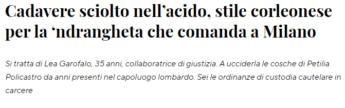 Ho scelto questo articolo perchè il gesto che ha fatto Lea Garofalo è stato forte e sintomo di coraggio, che però è seguito per forza di cose dalla paura che si porta dentro dopo aver collaborato con la giustizia.